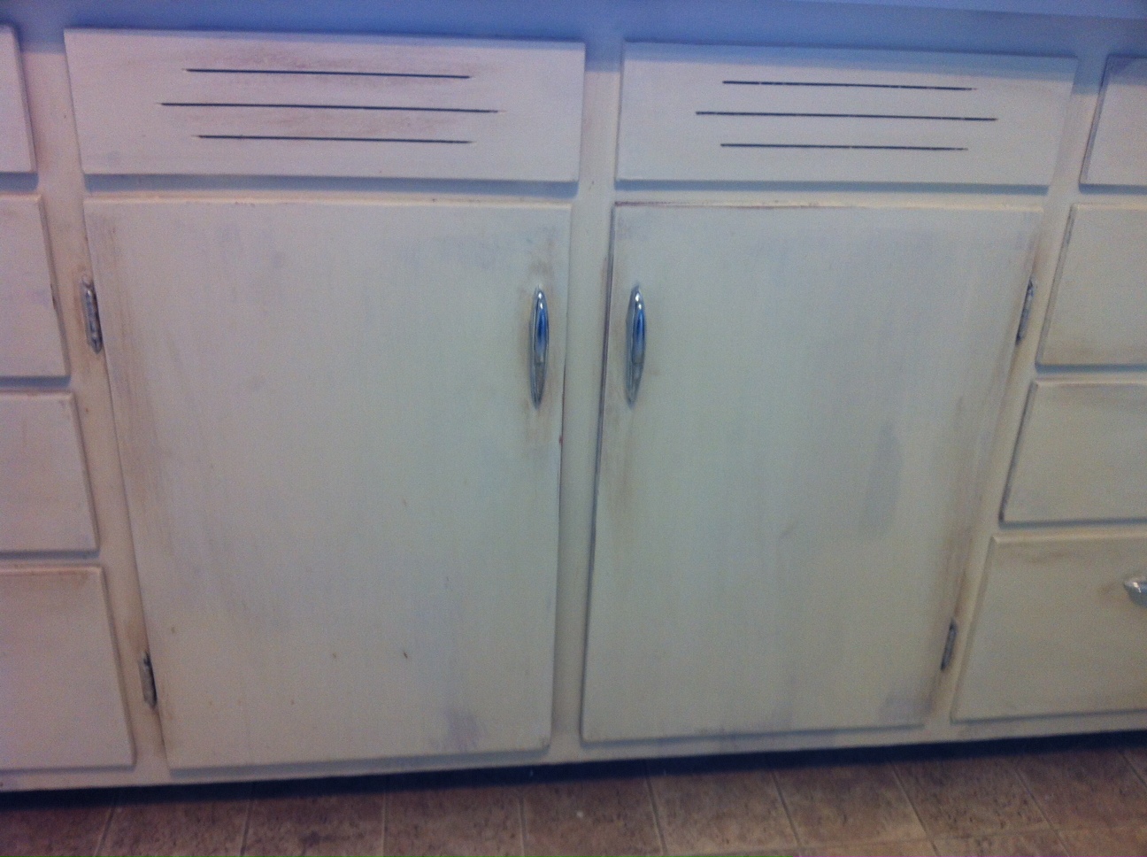 If you use the dark wax, always apply the clear first and use the dark very, very SPARINGLY. On my project, I painted the cabinets Old White, applied the clear wax, then brushed a mix of the dark and clear wax around the hardware, corners and just randomly. Although it wasn’t my original intention, I painted the hardware as well. I lightly sanded small portions of the doors to expose the oak beneath. Then I buffed the hardware with steel wool to expose the silver hardware. Then I covered with another light coat of the clear wax.