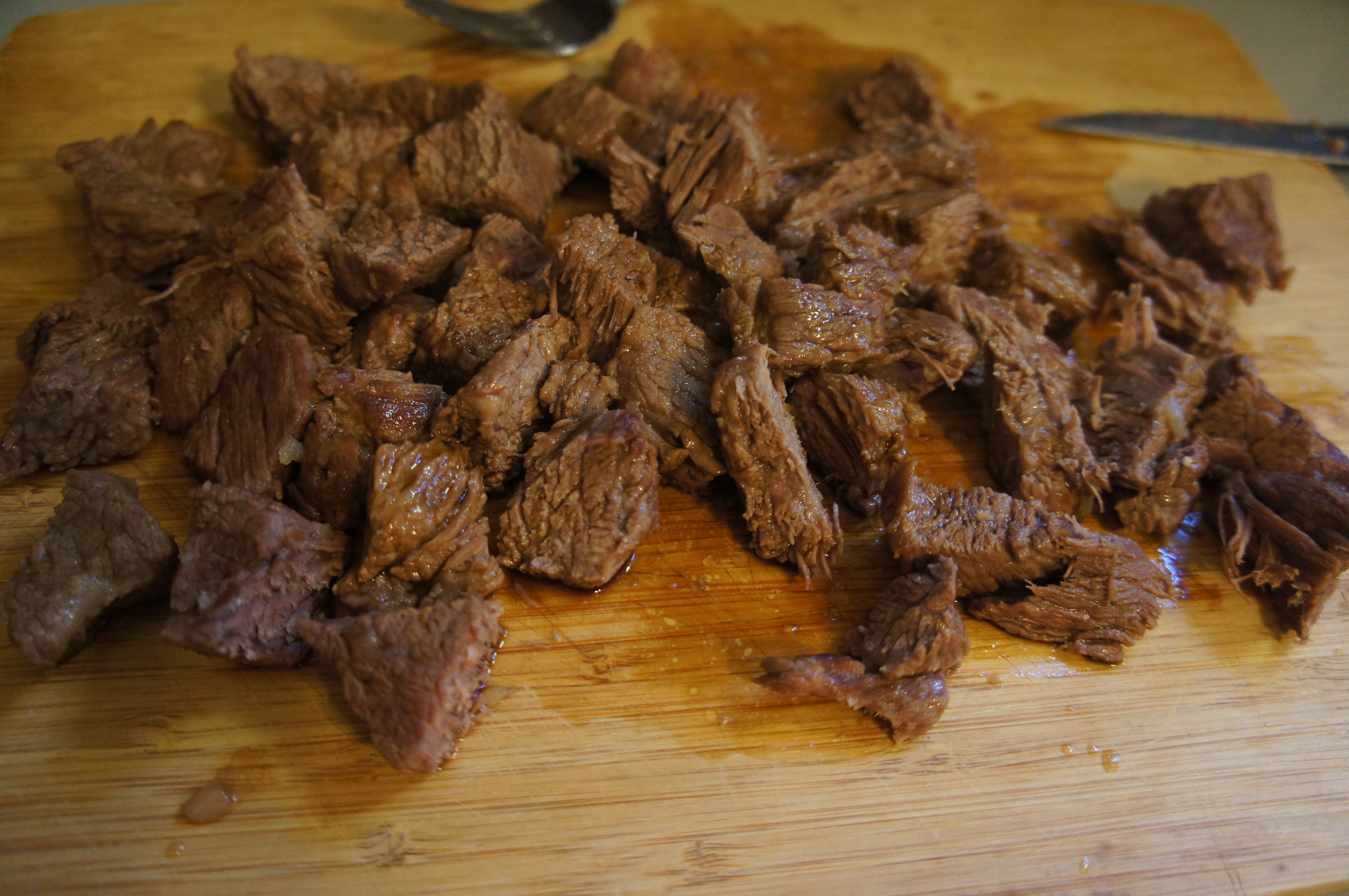 - After about an hour, remove beef and cut into smaller pieces. (If you bought pre-cubed beef, the pieces are probably too big, right?) This is a good opportunity to see how deliciously tender the beef is, take in the delightful aroma and get super hungry.