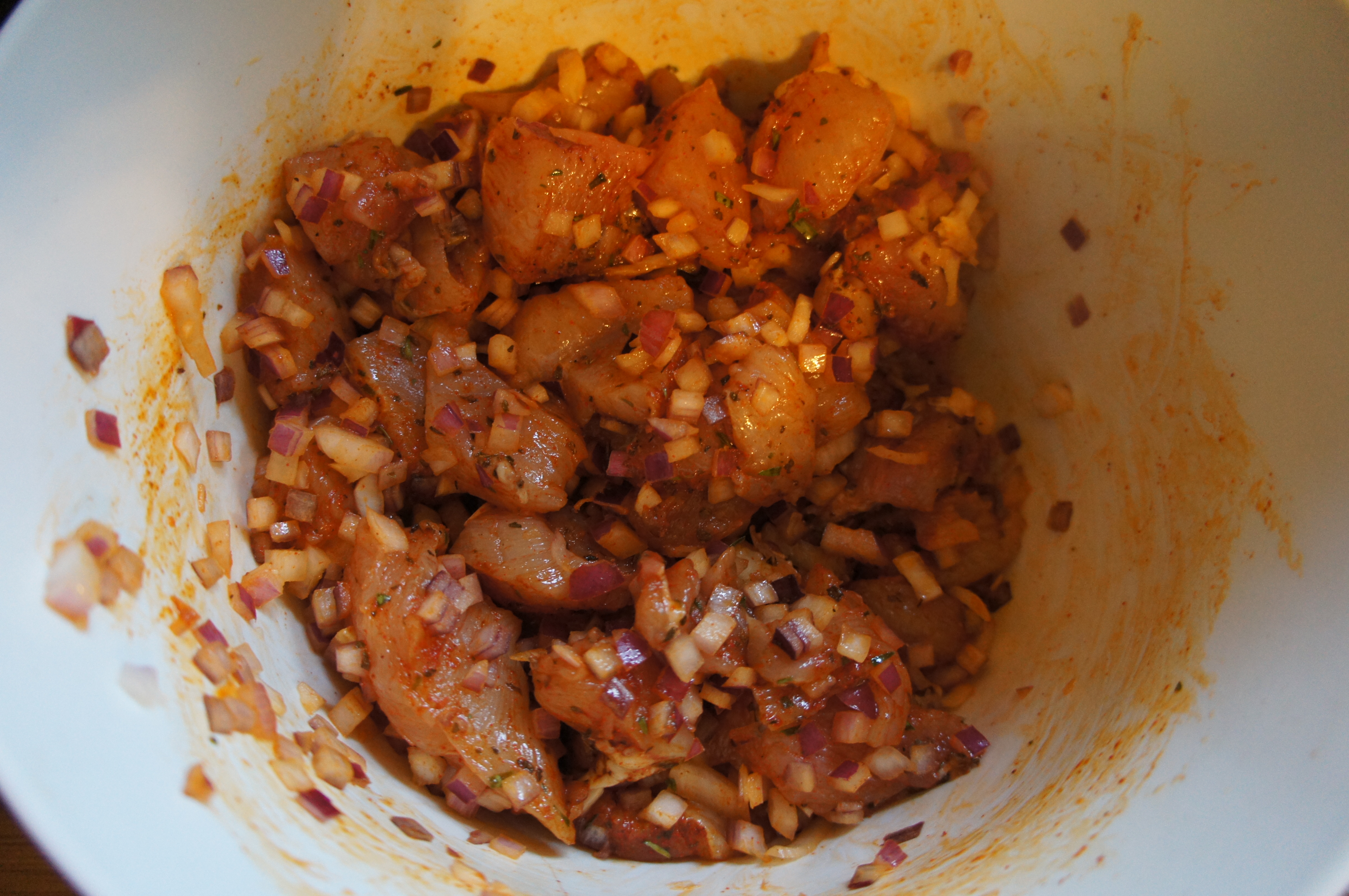1) In a medium-size mixing bowl, mix 2 tablespoons lemon olive oil, smoked paprika, oregano, salt and pepper. Add the chopped Spanish onion. Stir in the cut chicken pieces to coat. Cover and pop it in the fridge.