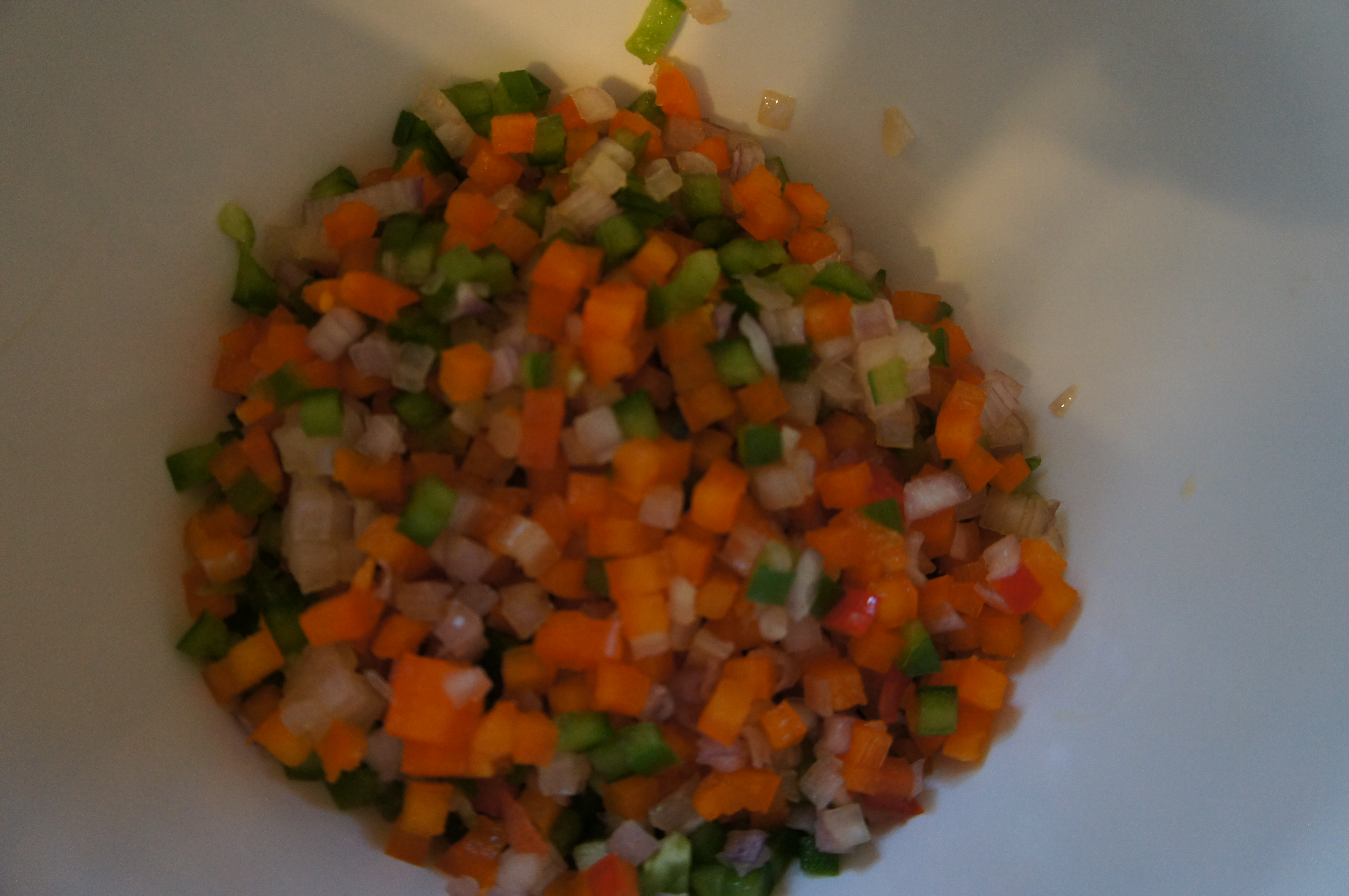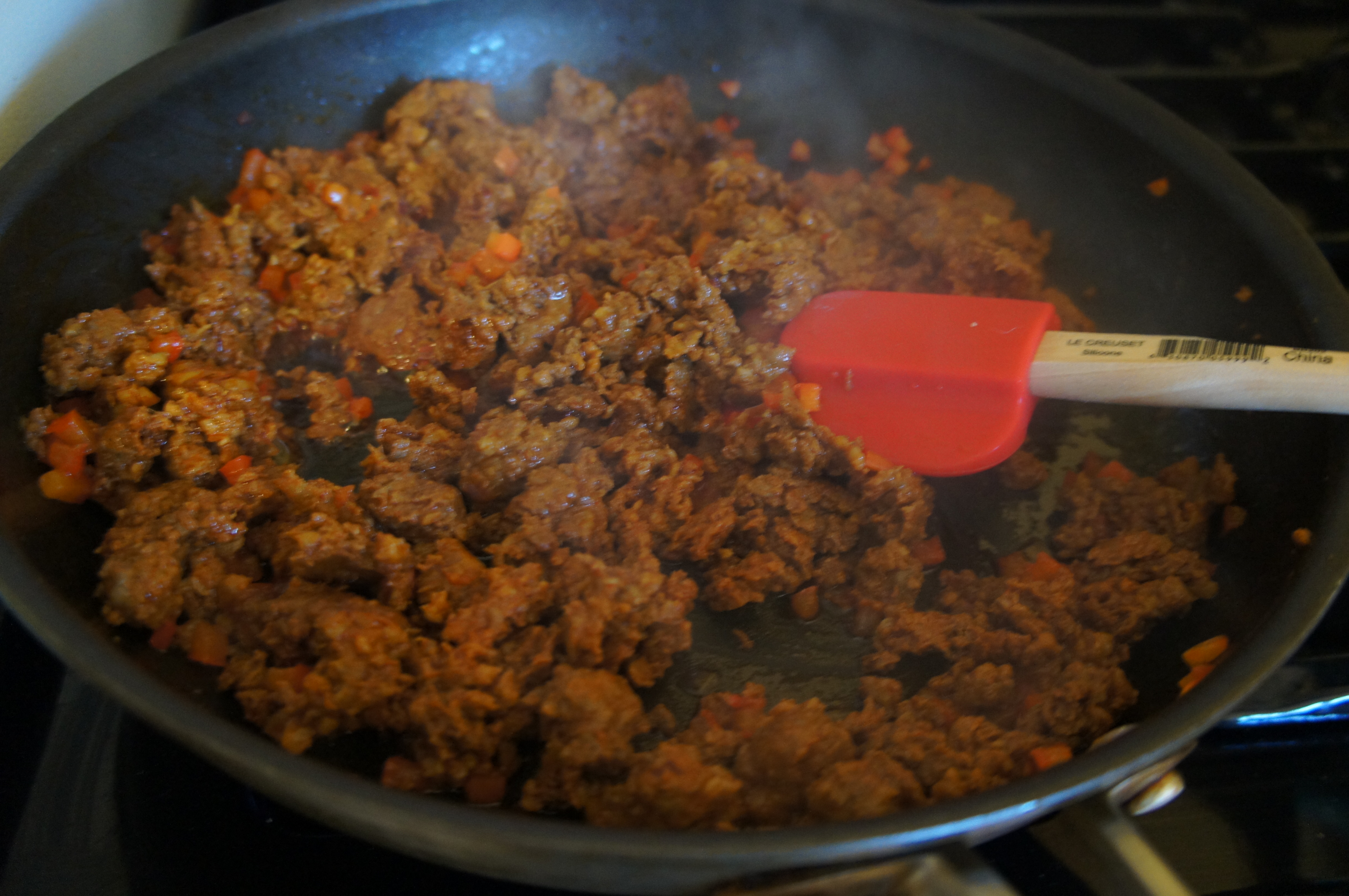 2) In a skillet, brown the chorizo and chopped red bell pepper. Once cooked, turn off heat.