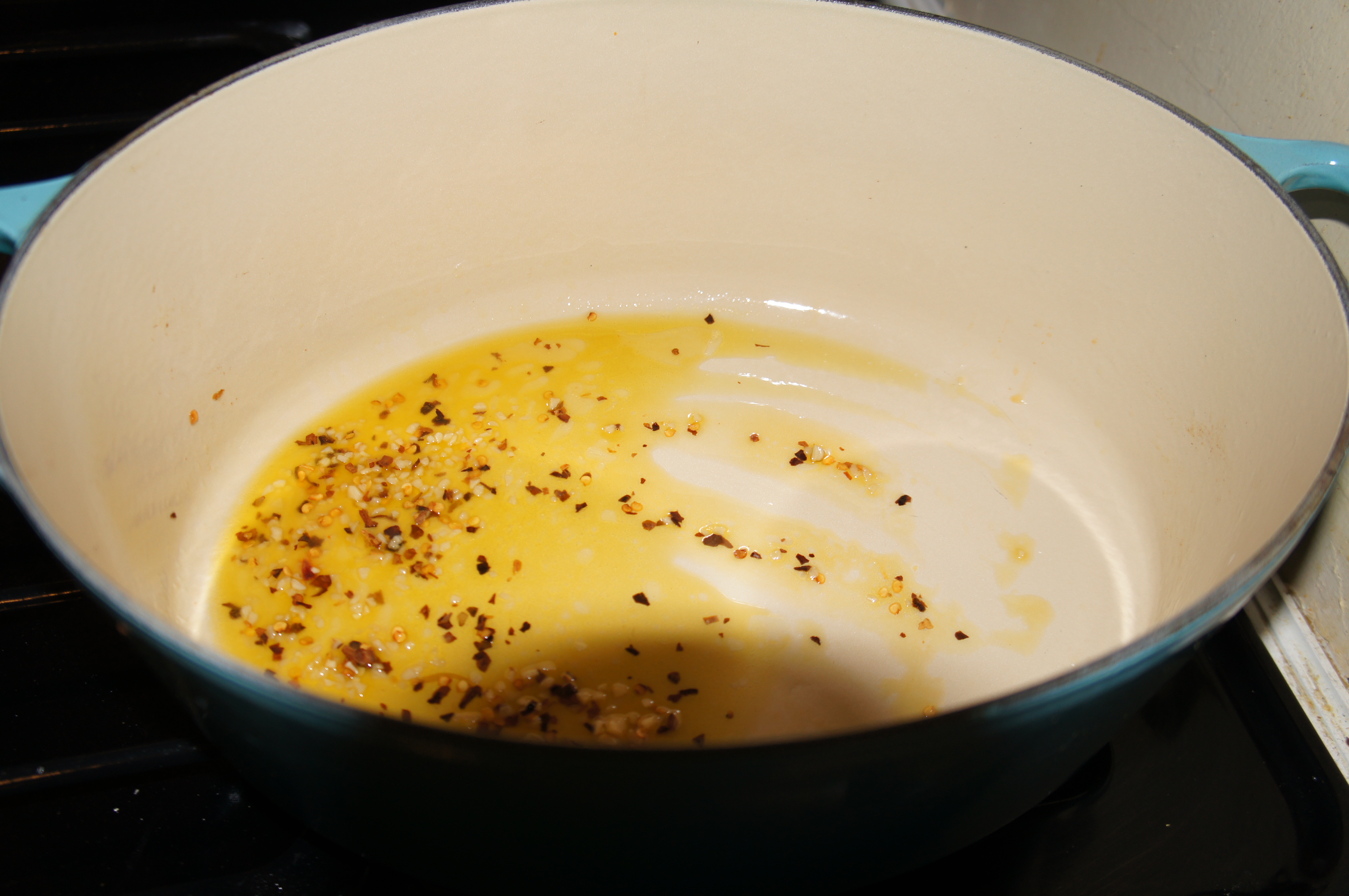 3) In a large dutch oven or pot (this is the one I used), heat two tablespoons lemon olive oil, red pepper flakes and garlic. Once the garlic is fragrant, stir in the bay leaf, parsley, chicken stock and lemon zest. Bring to boil, then reduce heat to medium low and add the browned chorizo. Cover and simmer.