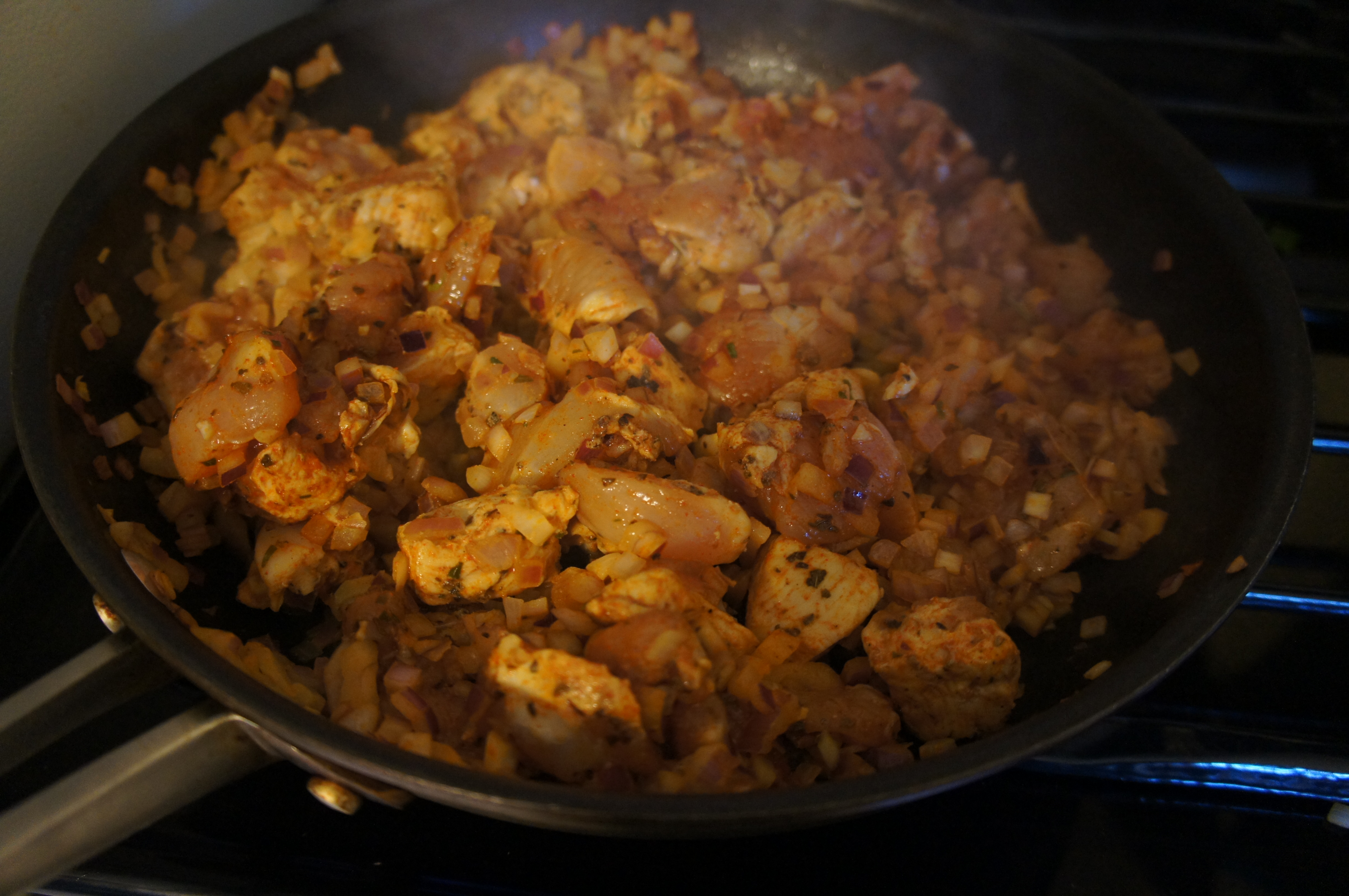 4) Grab the marinated chicken from the fridge and add to the skillet you used for the chorizo. Cook over medium about five minutes or until visibly done.