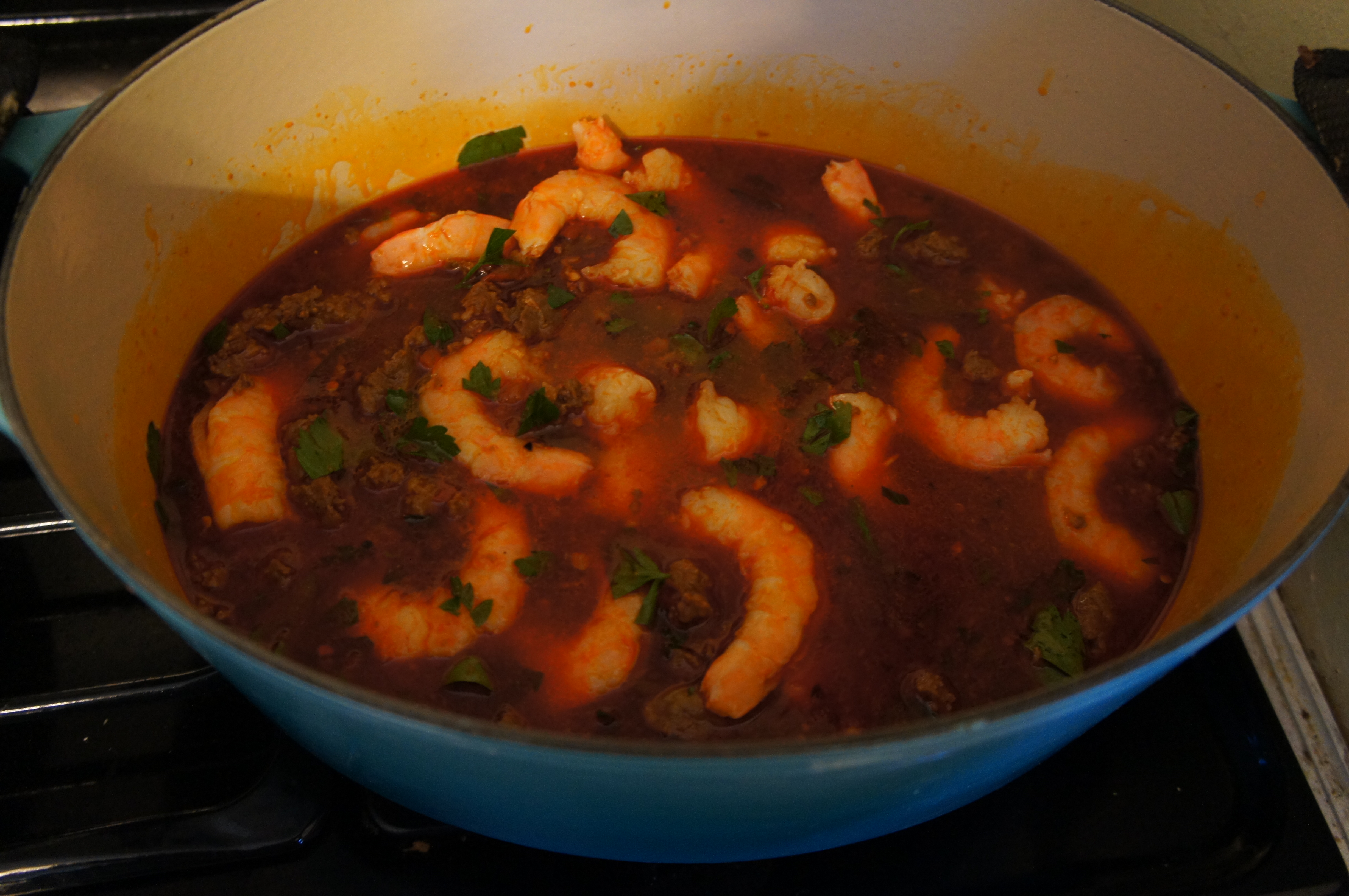 5) Add the cooked chicken and shrimp to the dutch oven. Cover and simmer about 20 minutes or so.