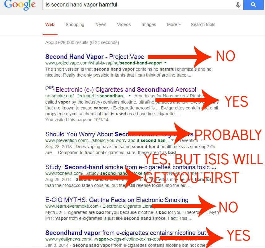 I referred to my favorite research tool, Google, (have you heard of it? it’s really great) to find out for myself. I immediately noticed the answers to the question “is secondhand vapor harmful?” vary greatly depending on the source.