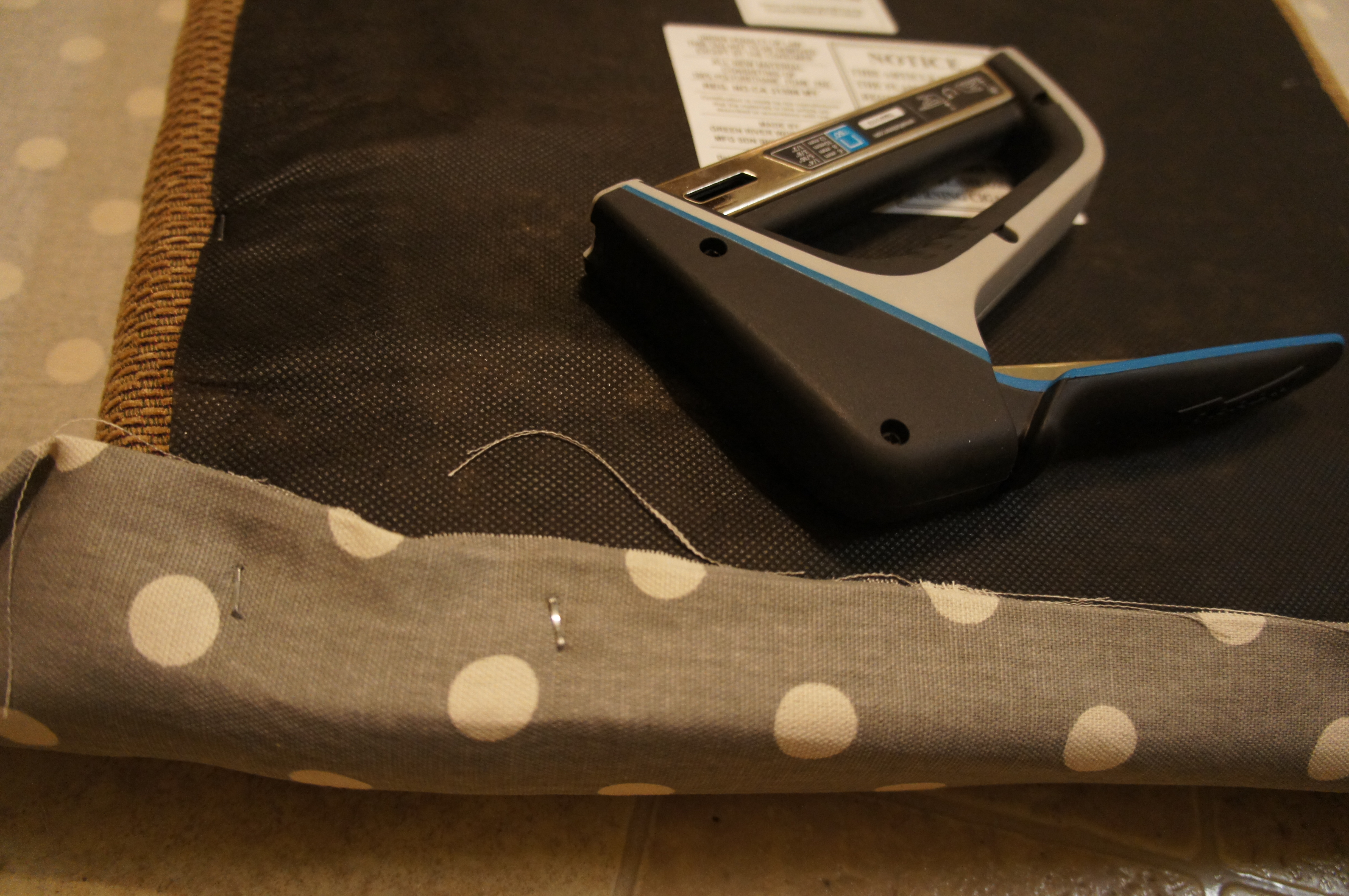 First I got the wrong staples for the gun I bought. SONY DSCThen I finally got a gun with the correct staples. SONY DSCBut then I didn’t get enough fabric to cover the cushions. SONY DSCTHE STRUGGLE! So after I made the necessary trips to rectify those issues, I was finally good to go. I’m no pro, so I basically folded the fabric over the cushions and stapled it to the back.