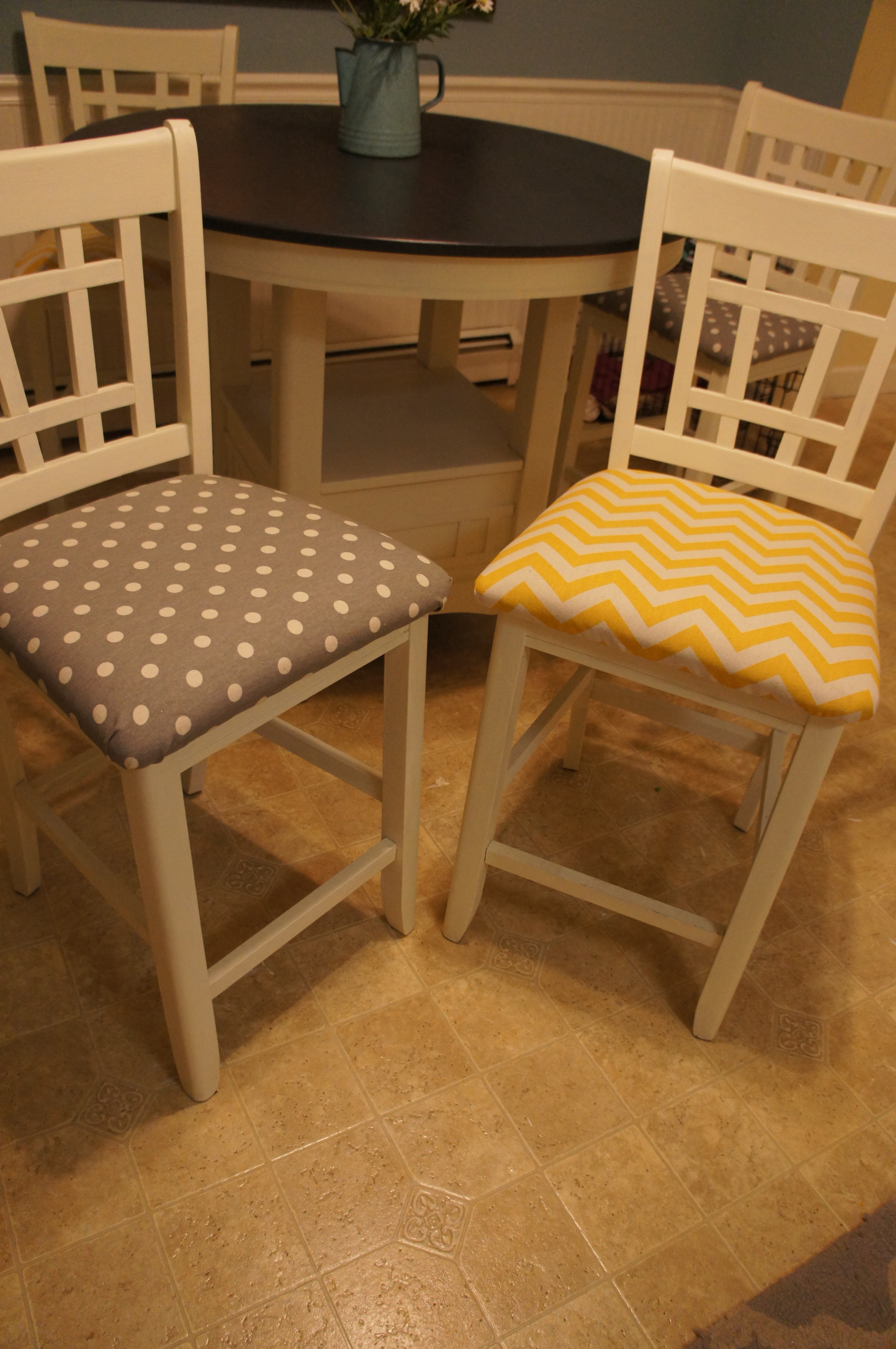 I love my old table and chairs now and think it fits perfectly in our new house. Plus, the project cost roughly $80, which included leftover paint and a new staple gun. Much less than a new table and chairs!